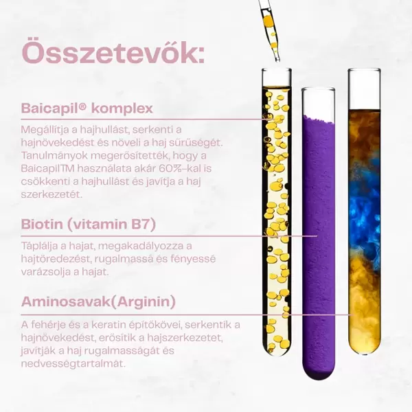 Akár háromszor gyorsabb hajnövekedést is elérhetsz! Főbb hatóanyagok - Baicapil™, aminosavak, biotin, koffein, B5 provitamin: