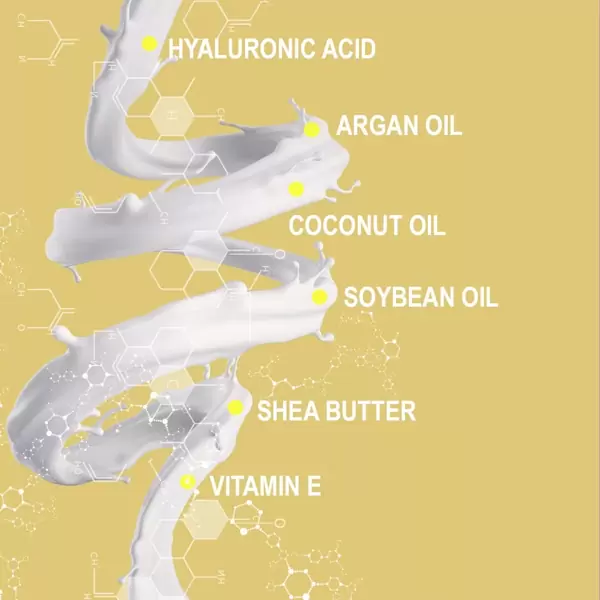 Balzsam: AQUA, CETEARYL ALCOHOL, BUTYROSPERMUM PARKII BUTTER, GLYCINE SOJA OIL, COCOS NUCIFERA OIL, GLYCERIN, DISTEAROYLETHYL DIMONIUM CHLORIDE, CETEARYL GLUCOSIDE, GLYCERYL STEARATE, SODIUM HYALURONATE CROSSPOLYMER, ARGANIA SPINOSA KERNEL OIL, SCUTELLARIA BAICALENSIS ROOT EXTRACT, GLYCINE SOJA GERM EXTRACT, TRITICUM VULGARE GERM EXTRACT, PANTHENOL, TOCOPHERYL ACETATE, PYRIDOXINE HCL, GLUCONOLACTONE, CALCIUM GLUCONATE, ARGININE, PENTYLENE GLYCOL, PROPANEDIOL, LACTIC ACID, PARFUM, SODIUM BENZOATE, POTASSIUM SORBATE, BENZYL ALCOHOL, DEHYDROACETIC ACID, CITRIC ACID, COUMARIN.